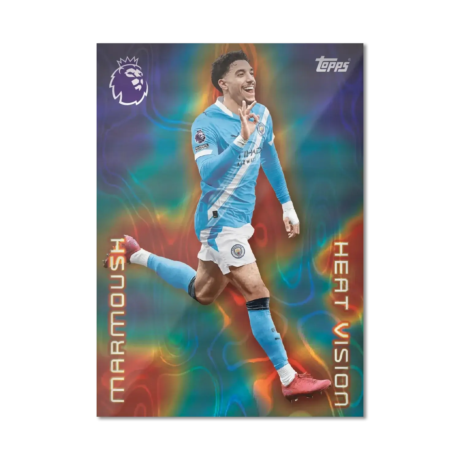 Topps Premier League 2026 trading card featuring Marmoush in Heat Vision style with vibrant colors.