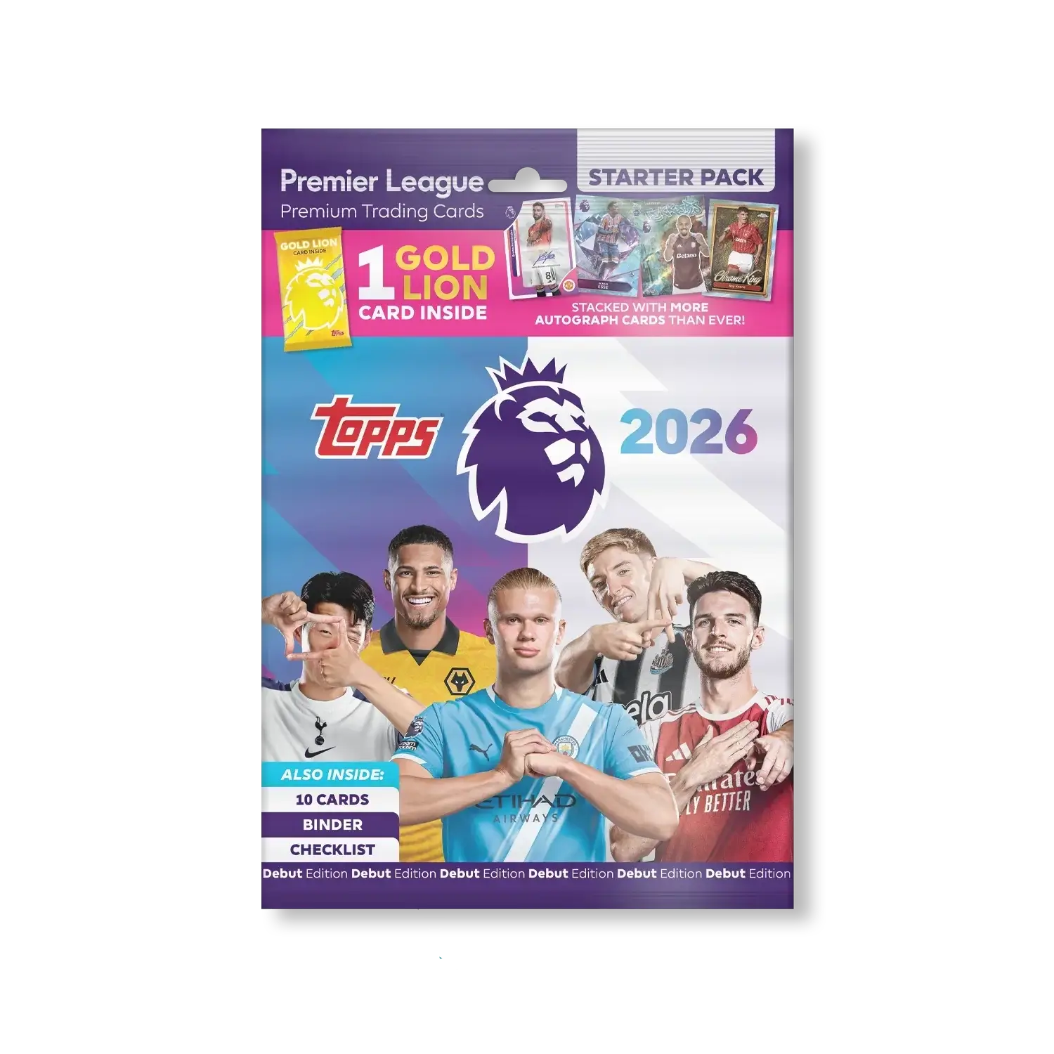 Topps Premier League 2026 Trading Cards Starter Pack with 10 cards and Gold Lion card included.