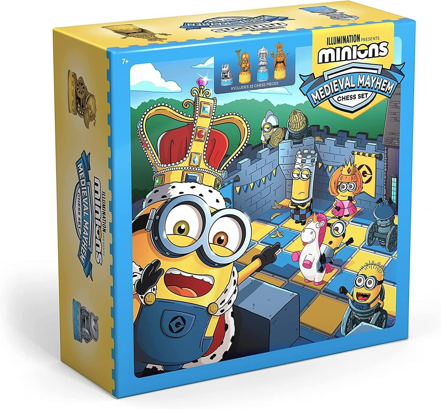 Minions Medieval Mayhem Chess Set Despicable Me featuring unique chess pieces and colorful board.