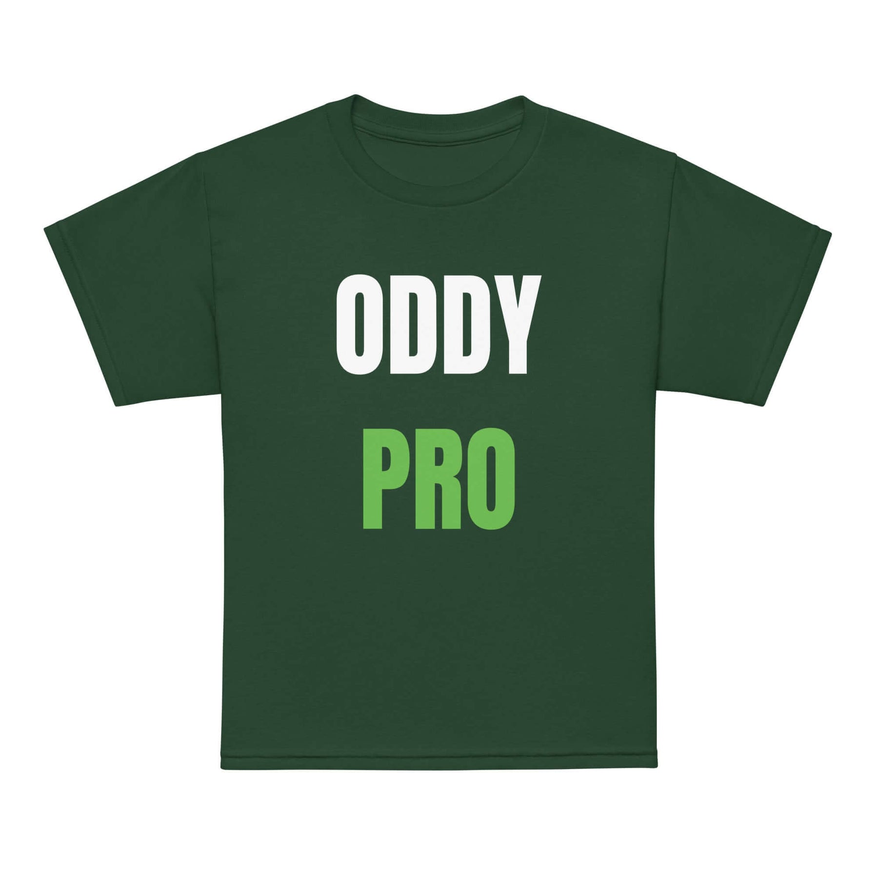 Oddy Pro Youth t-shirt in dark green with bold white and green lettering, perfect for active kids.
