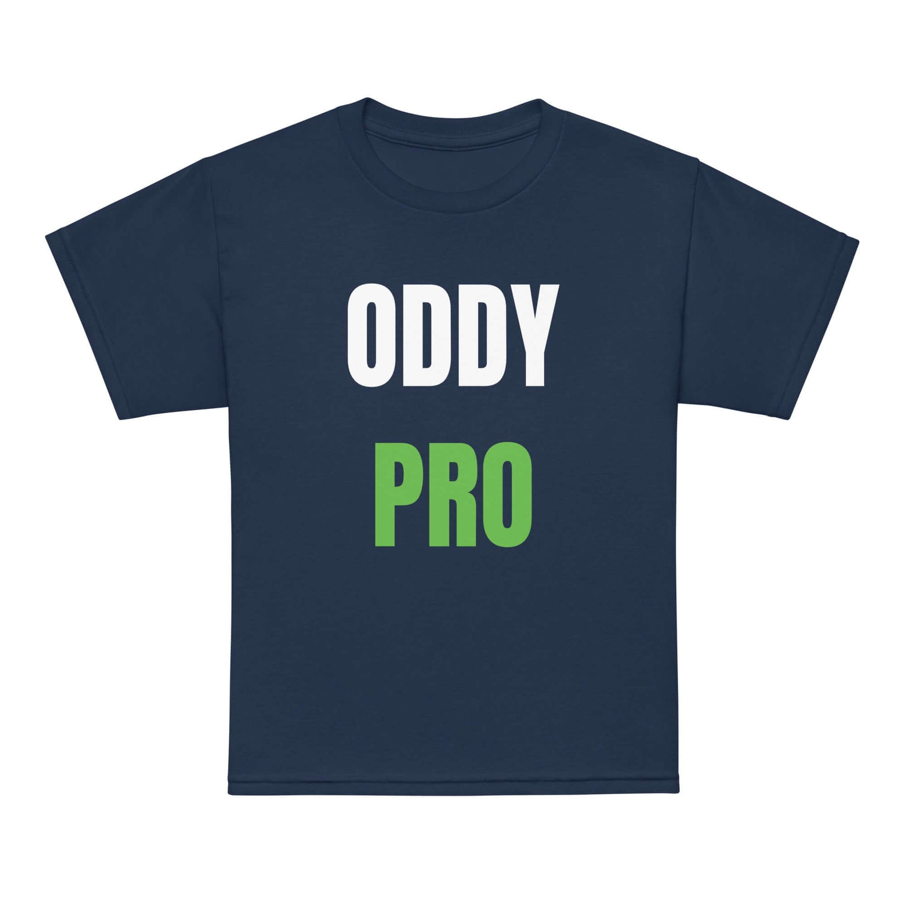 Oddy Pro Youth t-shirt in navy blue with bold white and green print, perfect for active kids.