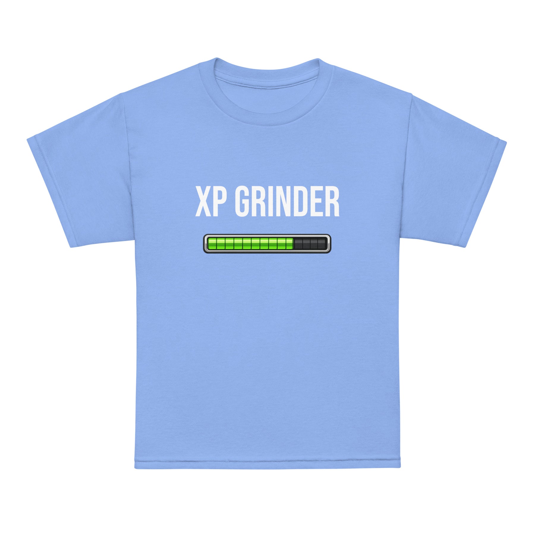 XP Grinder Youth t-shirt featuring a gaming-themed progress bar design on a navy blue background.